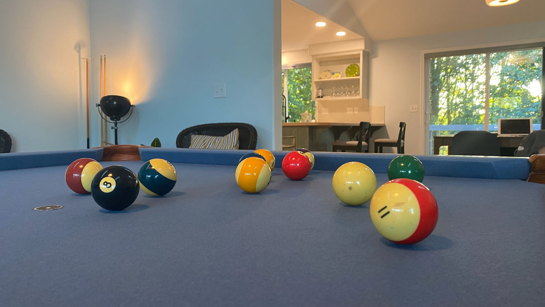 A slate pool table illuminated by hand crafted lighting from Spain stars in the great room of the Skylight House which includes a home theater, master suite, secondary suite, hot water bidets, and more amenities in a weekly rental.